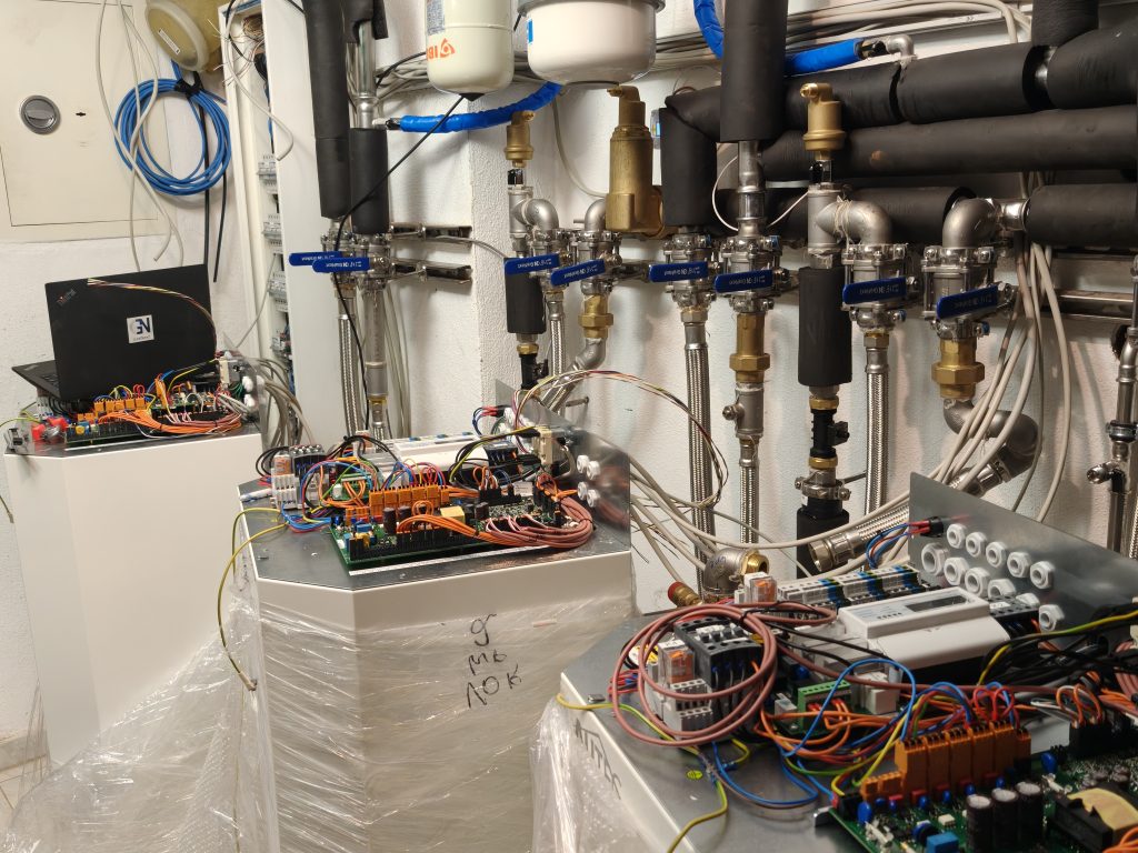 Installatie in opbouw van een hoogrendement warmtesysteem bestaande uit 3 × 30 kW warmtepompen in cascade, aangevuld met een 6 kW naverwarming voor thermische desinfectie van het boilerwater (legionellapreventie).