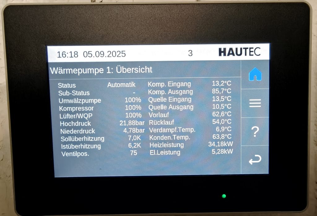 Vermogen: verwarmingsvermogen 34.18 kW, elektrisch 5.28 kW → momentane COP ≈ 6.5