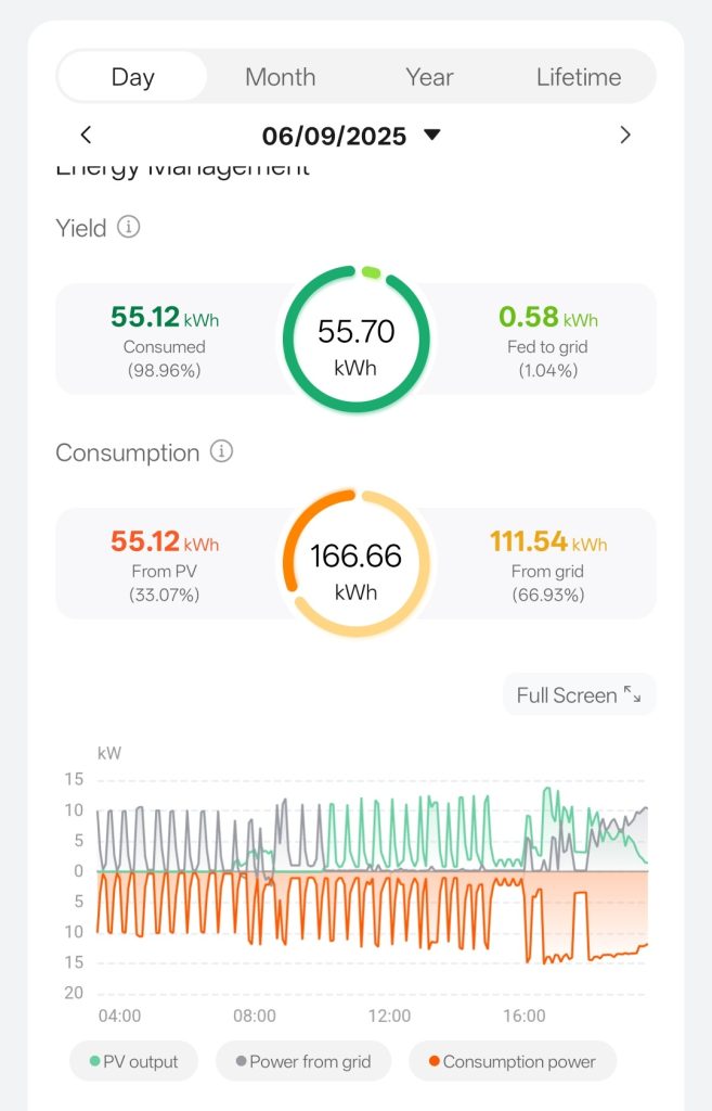 Dagresultaat: 55.70 kWh PV, 98.96% lokaal gebruikt, 0.58 kWh naar het net.